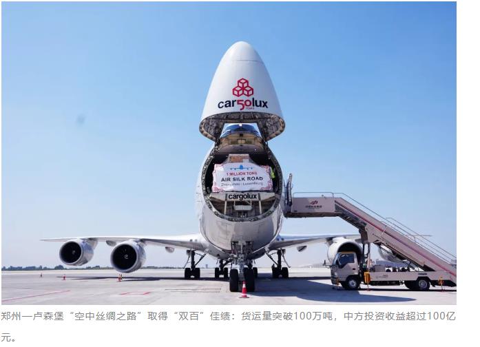 2014年1月,河南航投收購盧森堡貨航35%股權簽約儀式在鄭州舉行。同年6月,首條鄭州—盧森堡國際貨運航線開通,同年11月,盧森堡貨航鄭州航線貨運量就突破1萬噸;2015年11月,貨運量累計突破5萬噸,國際貨運量、國際貨運航線數(shù)、航班數(shù)量、國際通航點等主要指標躍居鄭州機場首位;2016年6月,累計貨運量突破10萬噸;2019年5月,50萬噸;2021年8月,80萬噸,2023年6月突破100萬噸。