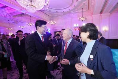貝泰爾在招待會的致辭中簡要回顧了商貿(mào)團(tuán)在北京和上海的交流情況,對參加招待會的各方代表表示感謝。致辭后,講臺上的貝泰爾看到張明超一行很是驚喜,立即向老朋友們舉手示意,并在隨后的自由交流環(huán)節(jié)與盧睿朗一起同張明超交談。