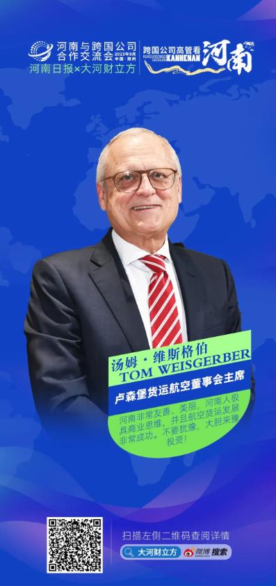 9月5日,盧森堡貨航董事會(huì)主席湯姆·維斯格伯前來鄭州參加河南和跨國公司交流合作會(huì),同行的還有盧森堡貨航總裁兼首席執(zhí)行官理查德·福森,兩位負(fù)責(zé)人聯(lián)袂遠(yuǎn)道而來,足見他們對(duì)河南的重視。