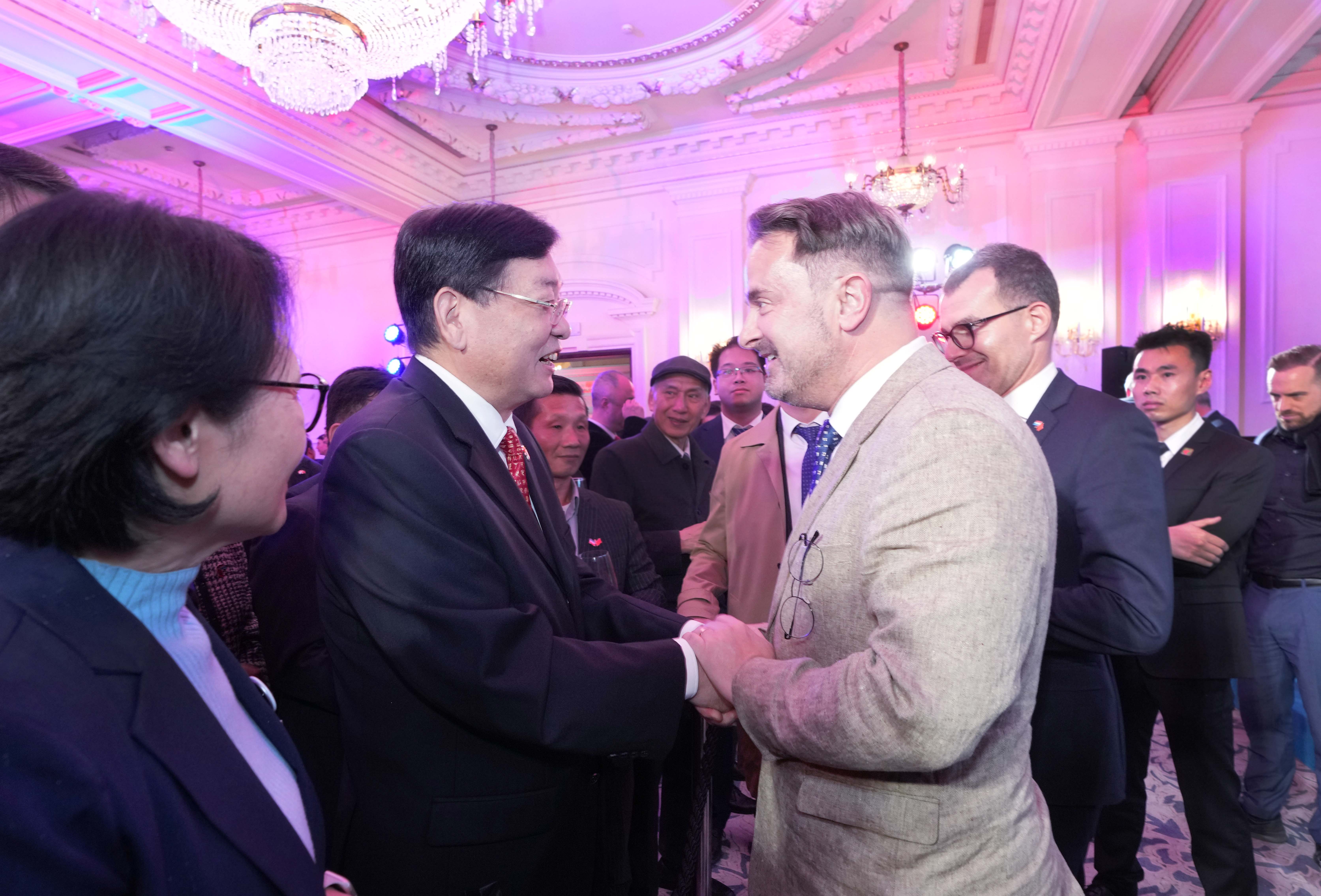 貝泰爾在招待會的致辭中簡要回顧了商貿(mào)團(tuán)在北京和上海的交流情況,對參加招待會的各方代表表示感謝。致辭后,講臺上的貝泰爾看到張明超一行很是驚喜,立即向老朋友們舉手示意,并在隨后的自由交流環(huán)節(jié)與盧睿朗一起同張明超交談。