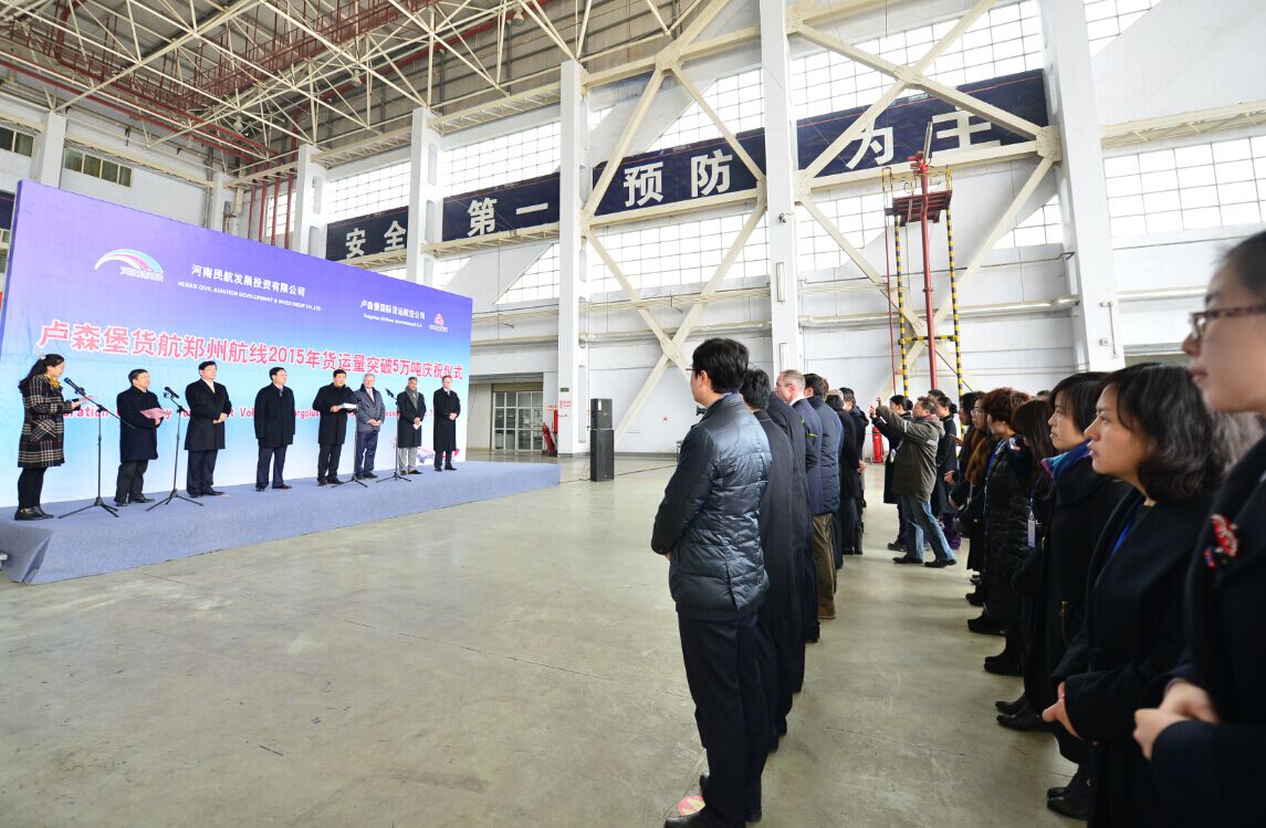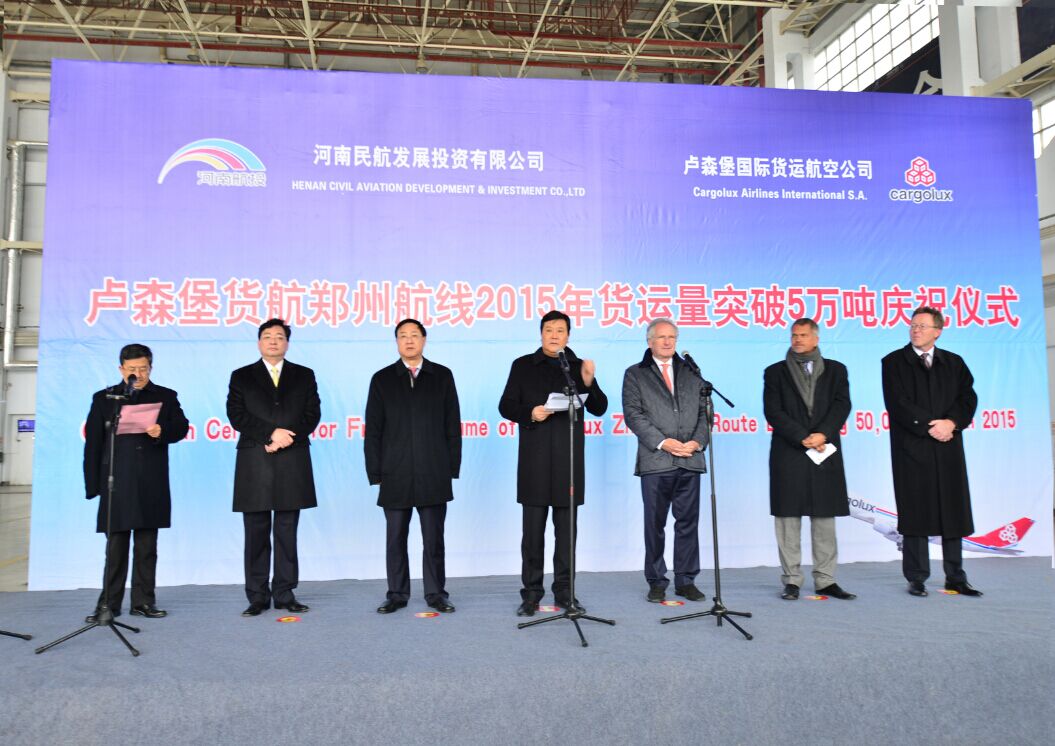 趙建才在致辭中指出:今年以來,河南航投與盧貨航圍繞“雙樞紐”發(fā)展戰(zhàn)略,充分發(fā)揮各自優(yōu)勢,努力搶抓國家“一帶一路”戰(zhàn)略機遇,推動了盧森堡貨航先進技術和管理經驗在實驗區(qū)的再造,帶動和促進了雙方區(qū)域經濟的協(xié)同發(fā)展和交流。開通了盧森堡至鄭州至芝加哥、鄭州至米蘭等洲際貨運航線,構建了以鄭州為中心,“一點連三洲,一線串歐美”的航空國際貨運版圖,在不到一年的時間里,航班加密至每周13班,年度貨運量突破5萬噸,為新鄭國際機場貨運量的快速提升做出了突出貢獻!這一可喜成績的取得,是盧森堡貨航與河南航投優(yōu)勢互補、協(xié)調發(fā)展、合作共贏的成功典范,是我們推動國家“一帶一路”發(fā)展戰(zhàn)略的生動實踐。希望盧貨航與河南航投搶抓實驗區(qū)戰(zhàn)略機遇,深入推進“雙樞紐”戰(zhàn)略實施,不斷豐富合作內容,加快推動以鄭州為樞紐的合資貨航、飛機維修基地、卡車航班的設立,積極培育河南參與國際分工與合作的新優(yōu)勢,促進河南與盧森堡乃至歐亞之間的經貿、文化、旅游等全方位的交流合作!